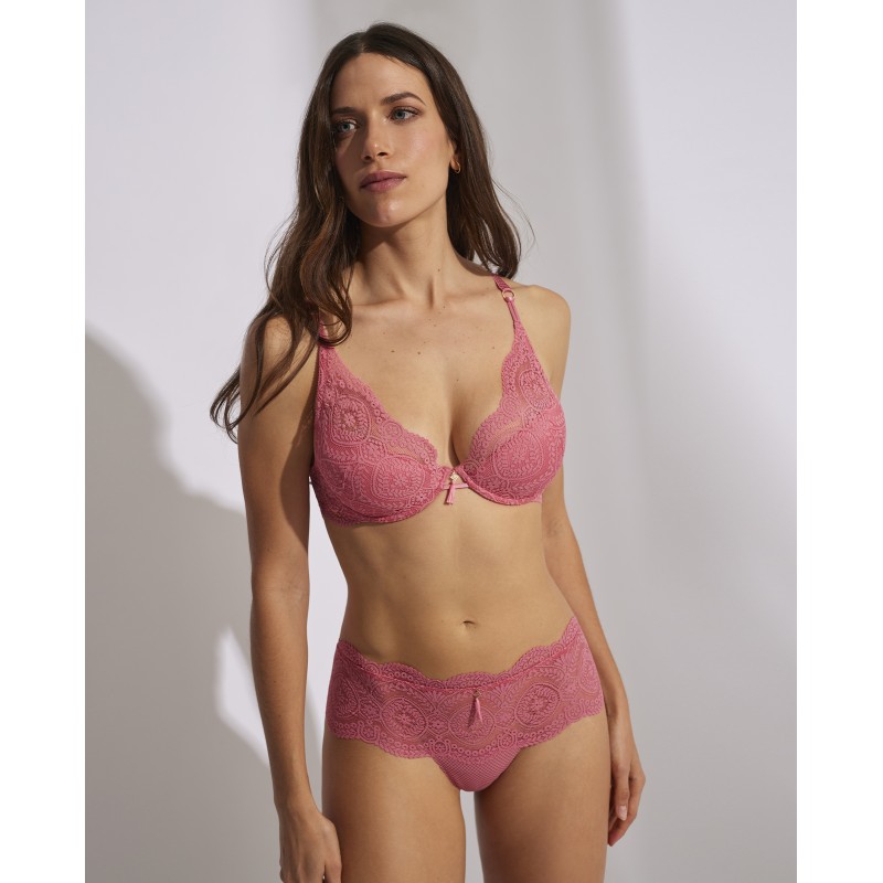 Deep neckline bra. Shapes and enhances. Its spectacular lace design gives it a romantic and bohemian style at the same time. This garment combines sensuality, freshness and elegance, ideal for free and authentic women.
