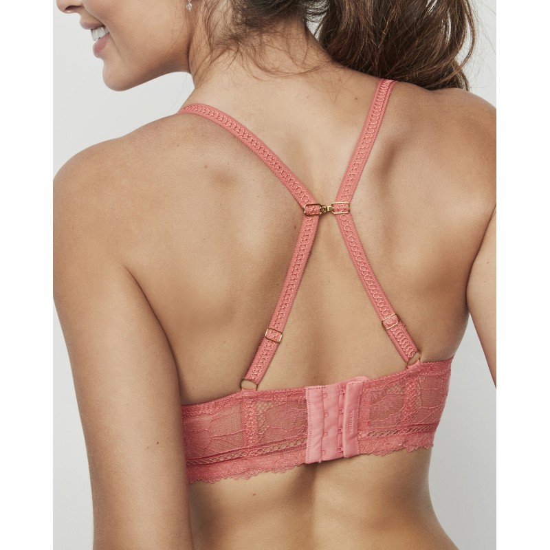 Deep-cut bra with floral lace details. It has underwire and a half foam cup. Without a base. It shapes and enhances. Its straps have flat buckles that do not bulk up and, in addition, they have two width measurements depending on the size to adapt and guarantee comfort and good support. A delicate and sophisticated garment. The Agatha collection, to which it belongs, embodies the maturity and splendor of the brand, offering pieces that not only adorn, but transform. A collection with charm and charisma.