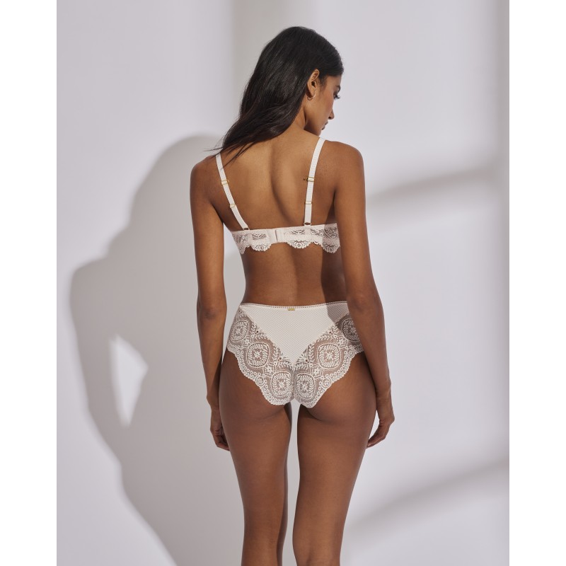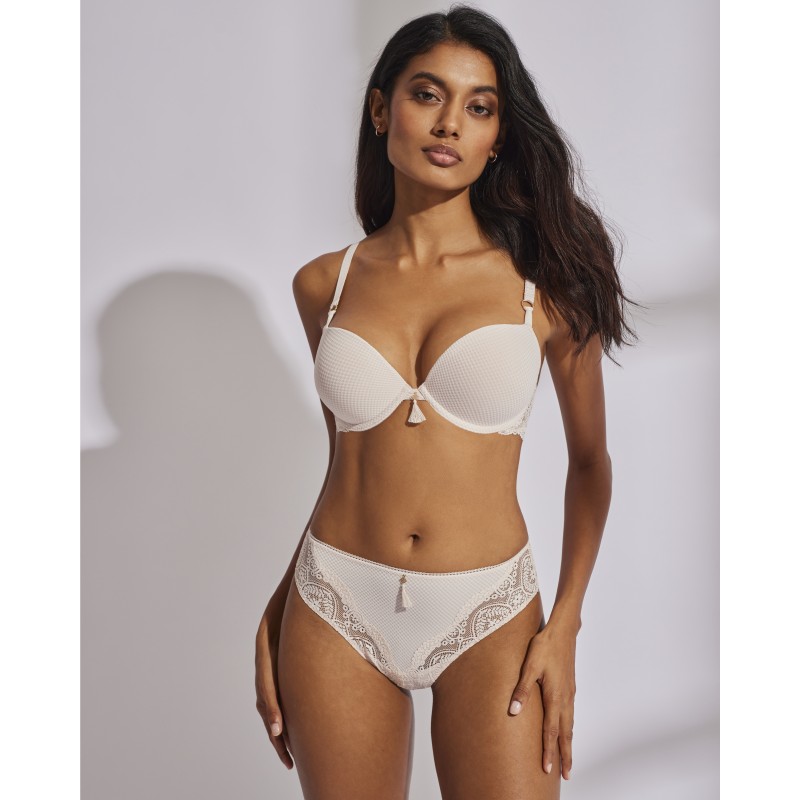 SuperBra double padded bra. Firms the chest and increases up to two sizes. Its spectacular lace design gives it a romantic and bohemian style at the same time. This garment combines sensuality, freshness and elegance, ideal for free and authentic women.