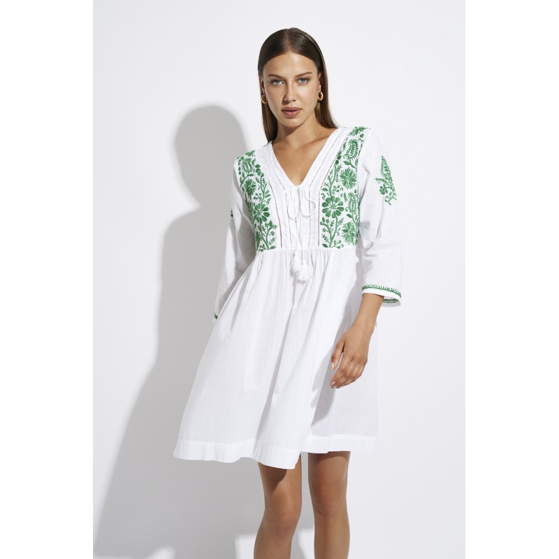 Short embroidered dress. With light sleeves, fine fabric and delicate embroidery on the front, sleeves and back.