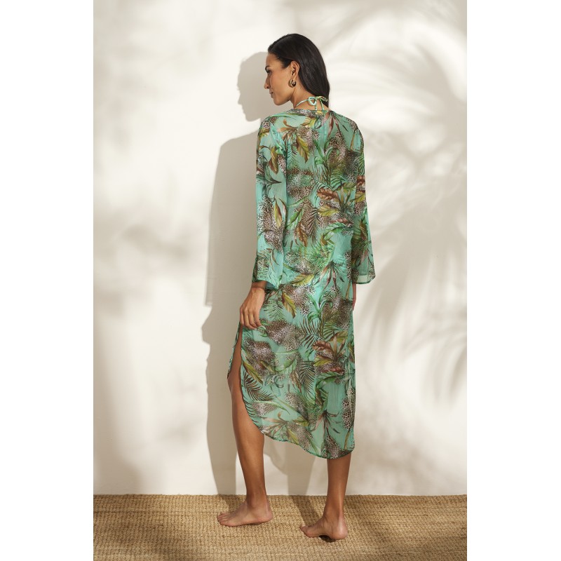 Very fresh fabric dress with sleeves. Ideal to wear over your bikini or swimsuit this season.