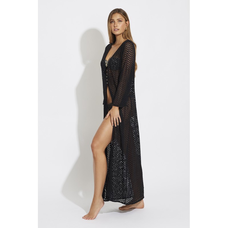 Long dress with sleeves. Of fine and elegant fabric, ideal to carry on your bikini or swimsuit this summer.