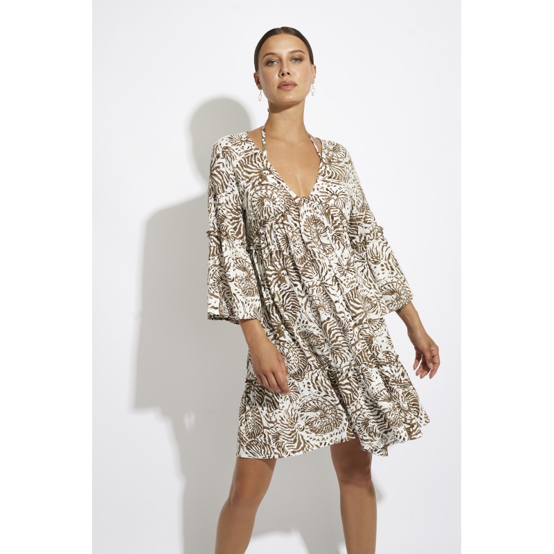 Short dress with sleeves. Ideal to wear over your bikini or swimsuit. Its striking ethnic shell design inspired by dream beaches will captivate you.