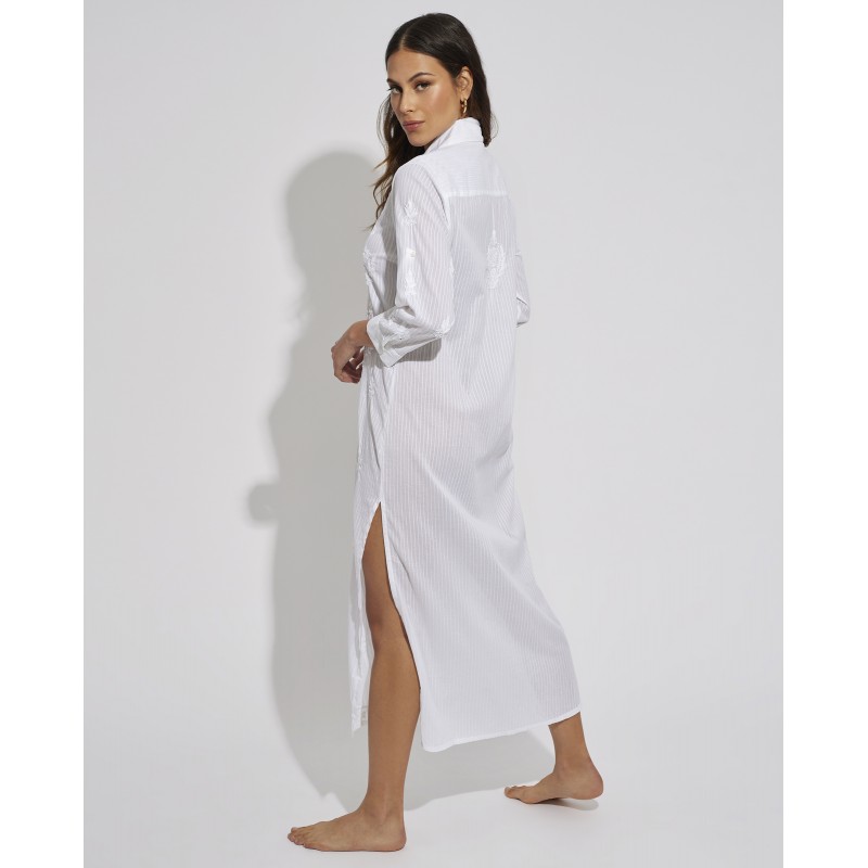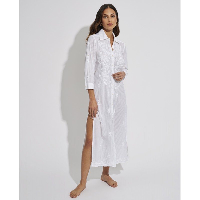 Long shirt style dress with buttons on the front. A very versatile piece with a very feminine and youthful embroidery.