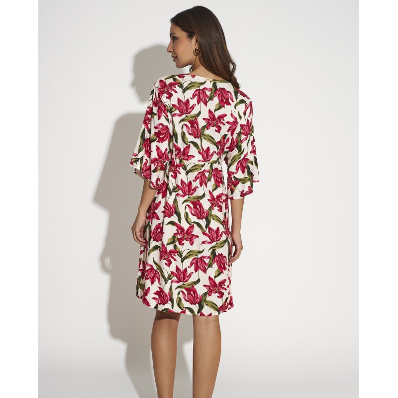 Short dress with sleeves. With a tropical print that evokes the beauty of a paradise island. Its color and freshness transmit the joy and energy of the most anticipated season of the year. Ideal to wear over your bikini or swimsuit this summer.