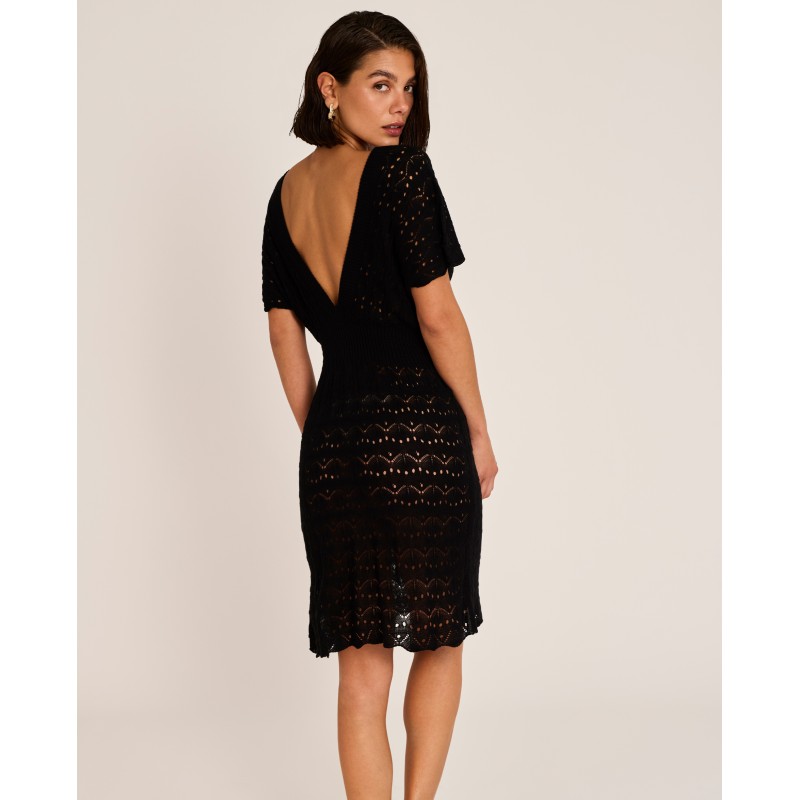 Short knit dress with a V-neck. Its design flatters the figure with a feminine and sophisticated look. A comfortable and versatile piece for summer days.