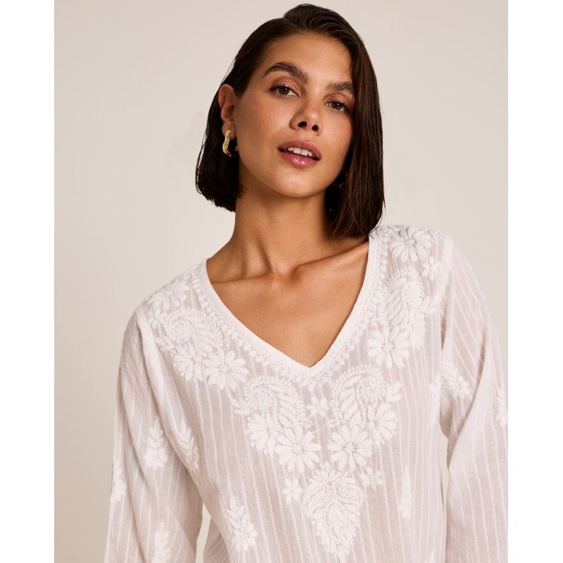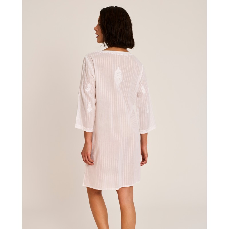 Short tunic-style dress. Featuring exquisite embroidery that adds a touch of freshness and originality, this dress is a truly unique piece. Perfect for wearing over your bikini or swimsuit.