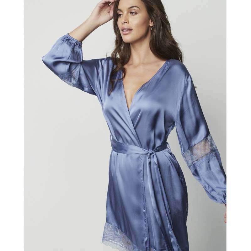 Short lingerie robe combined with lace on the sleeves and along the length of the garment, and a bow to tie at the waist. A delicate and sophisticated garment. The Agatha collection, to which it belongs, embodies the maturity and splendor of the brand, offering pieces that not only adorn, but transform. A collection with charm and charisma.