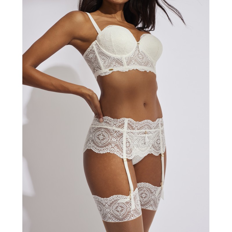 Garter belt with a delicate lace design gives it a romantic and bohemian style at the same time. This garment combines sensuality, freshness and elegance.