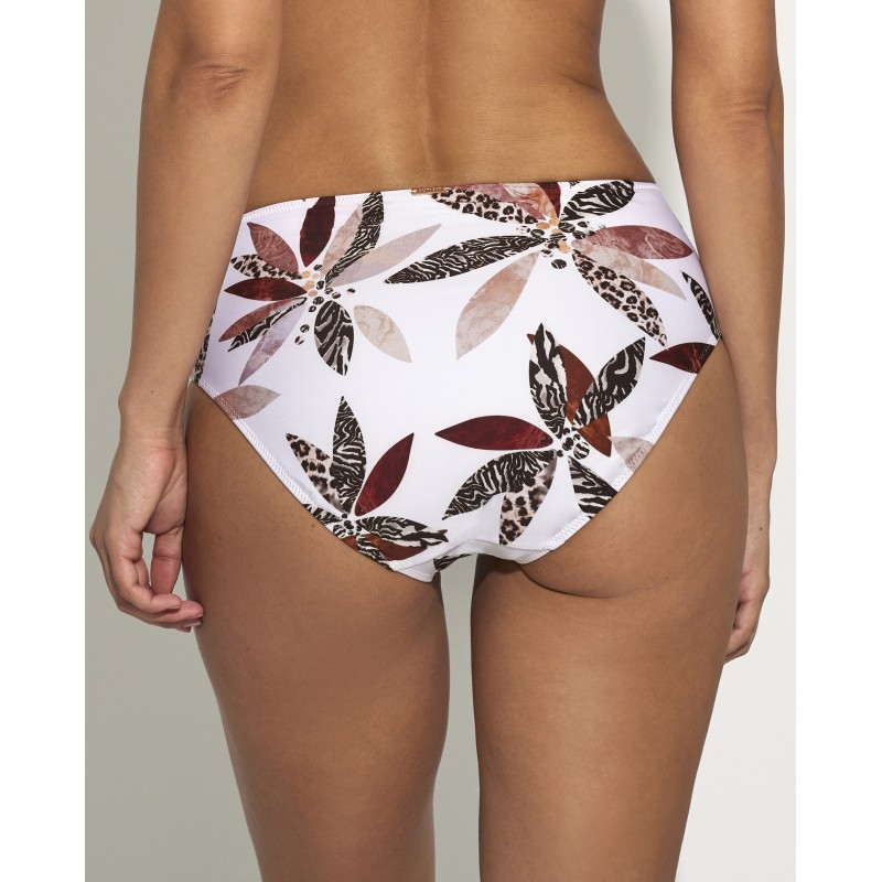 High-waisted bikini bottoms with classic cut. Its jungle print conveys a feeling of freshness, joy and exoticism. It is a perfect piece to show off a wild and tropical style on the beach or pool.