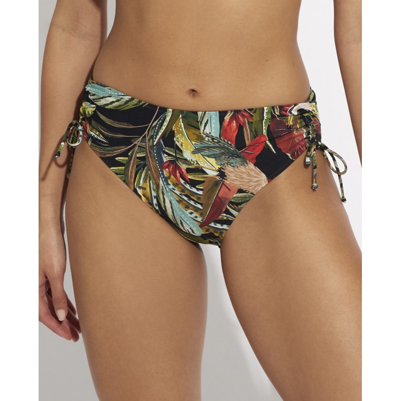 High-waisted bikini bottoms with classic cut. This spectacular design with vibrant tones inspired by wild flora and fauna reflects the exuberance and vitality of tropical wild nature.