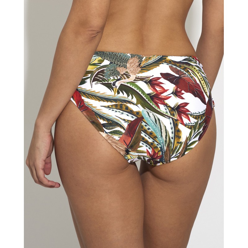 High-waisted bikini bottoms with classic cut. This spectacular design with vibrant tones inspired by wild flora and fauna reflects the exuberance and vitality of tropical wild nature.
