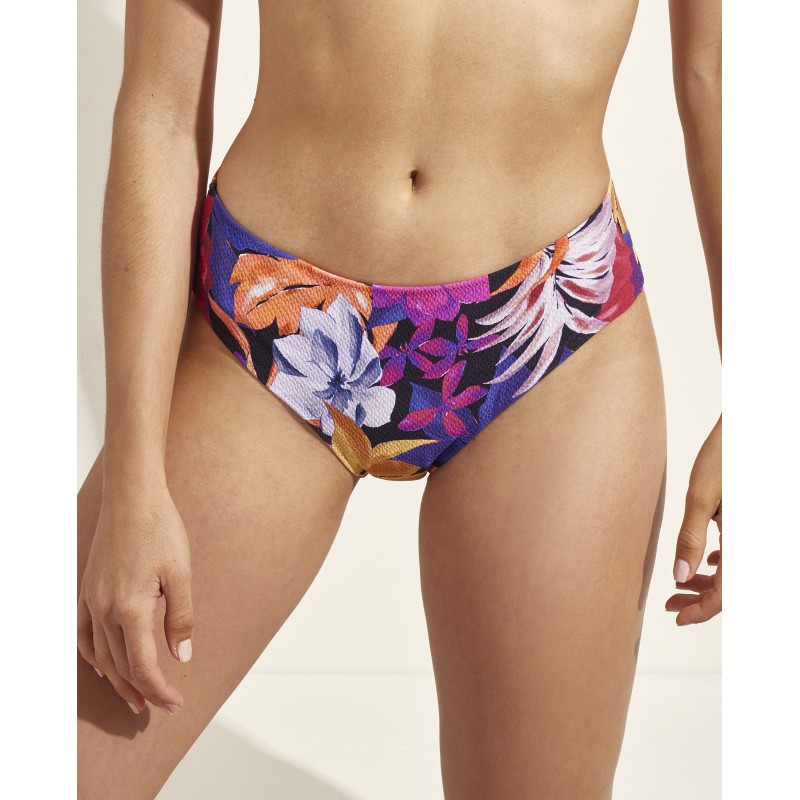 High-waisted bikini bottom. With a very tropical print full of bright colors that evoke the holiday spirit.