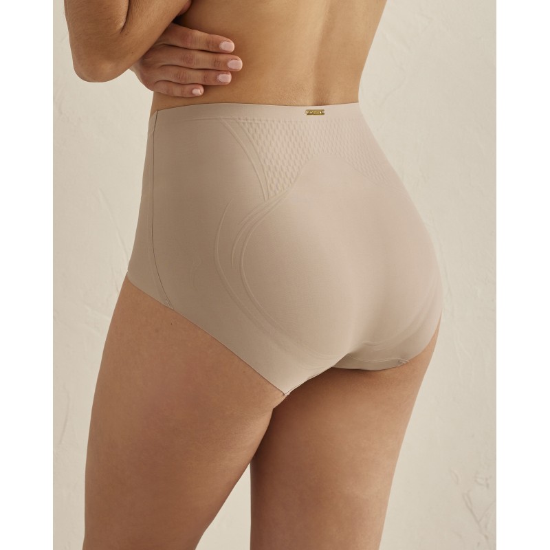 High-waist girdle. Reduces and shapes. Features internal transfers for selective retention and a bonding finish. Compression level 4.
