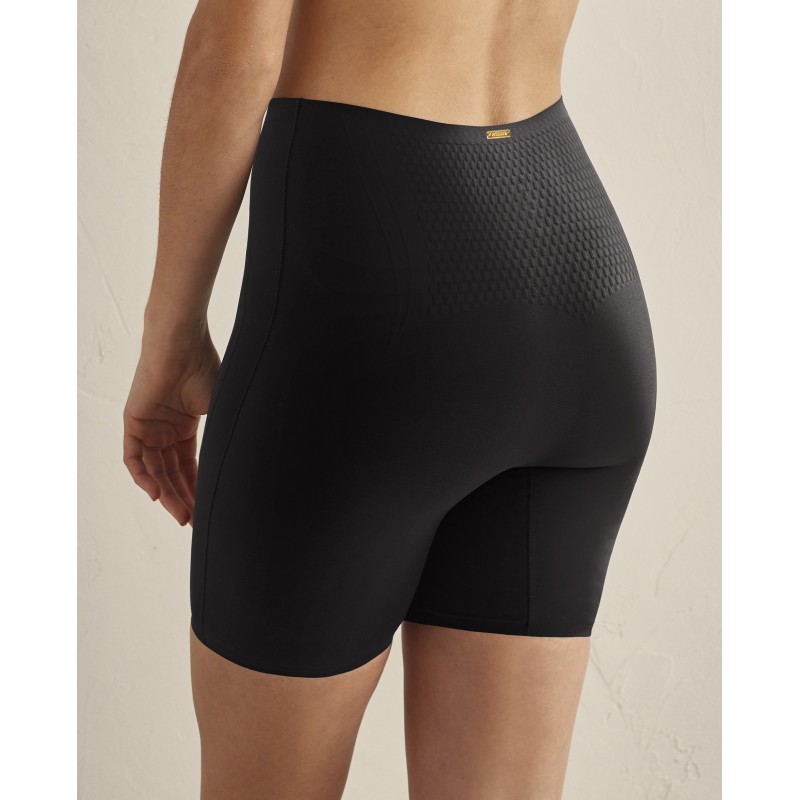 Very high-waisted trouser girdle. Reduces and shapes. Features internal transfers for selective retention and an invisible bonding finish, without marks or discomfort. Reduces and smoothes saddlebags while preventing chafing between the thighs.