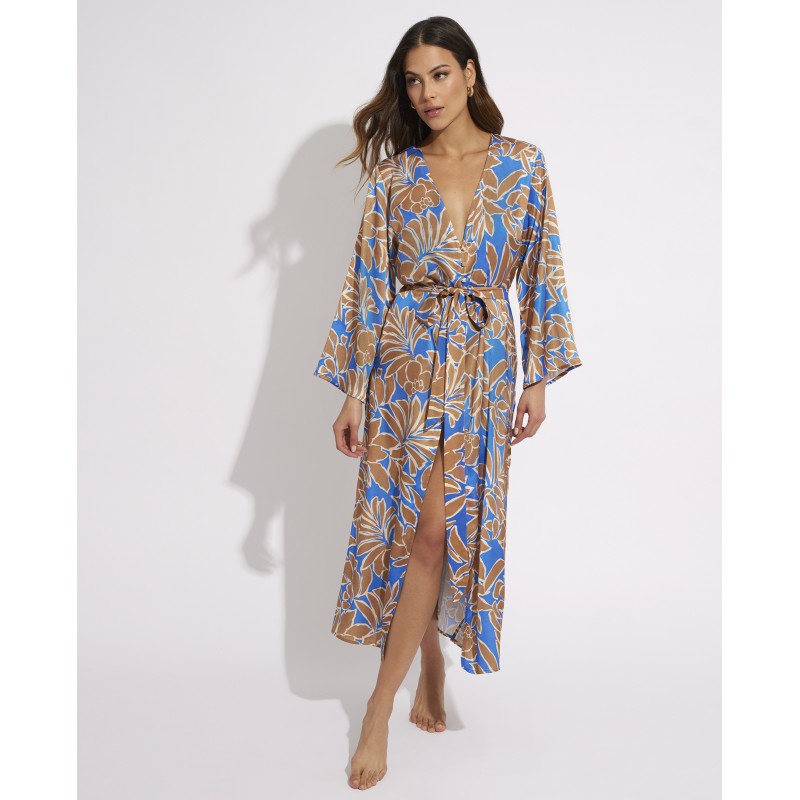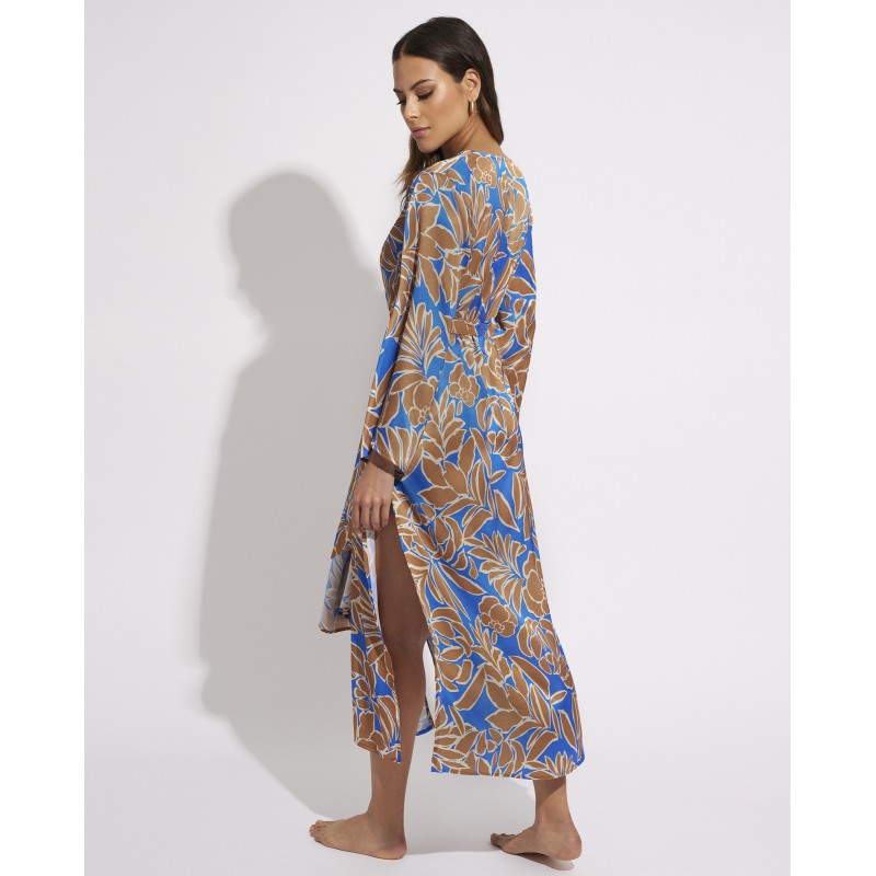 Long kaftan with sleeves. This fresh and natural design evokes the feeling of being in a tropical environment and in contact with nature. It is perfect to wear with your bikini or swimsuit this vacation.