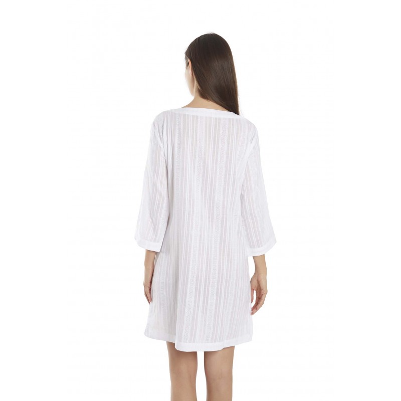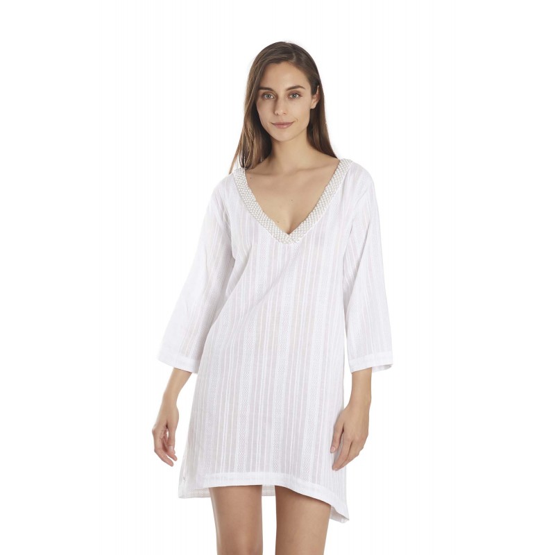 Half-sleeve kaftán in fine fabric. V-neck. The detail of the pearls around it make it a very special garment.