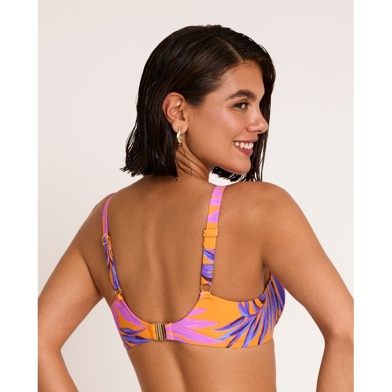 Full-coverage bikini top without padding. Features underwire and adjustable straps for a perfect fit. A tropical-inspired print in vibrant summer colors. Ideal for enjoying the sun this season. Made with recycled materials.