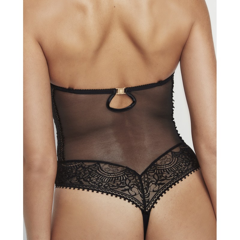 Lingerie bodysuit. With an inner cup, underwire, and removable straps. This garment is the perfect fusion of boldness and delicacy combined with lace and sheer fabric. Designed to leave a lasting impression, it reflects the magic of evenings where elegance and sensuality take center stage. Its design is part of the Aurum collection, created in collaboration with Pilar Rubio to commemorate our 50th anniversary.