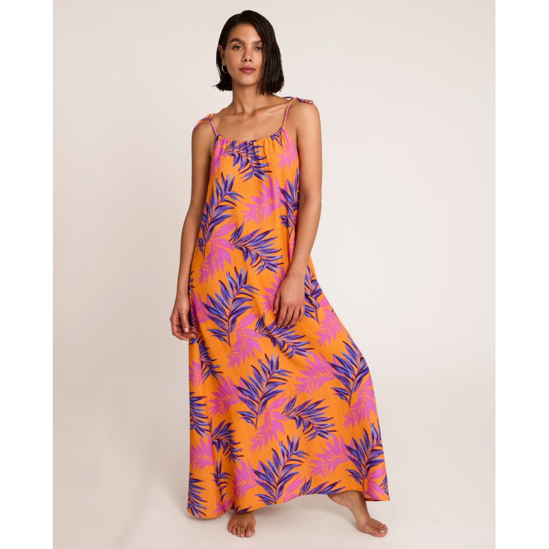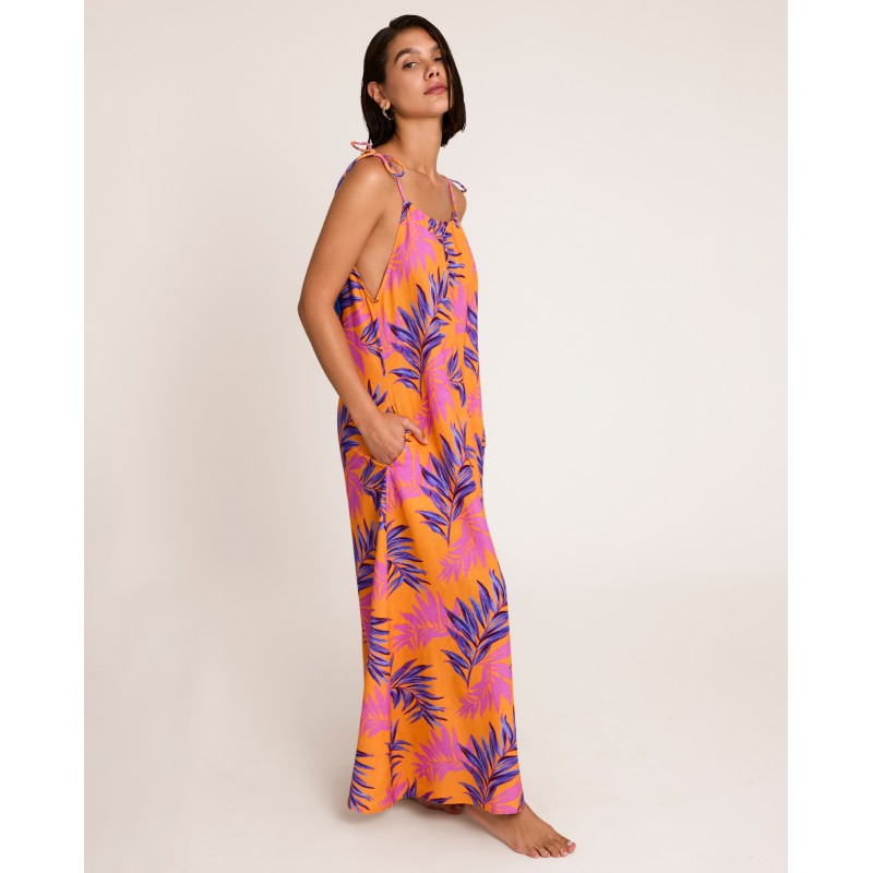 Long, flowing dress with a halter neckline and thin straps. Featuring a tropical-inspired print and vibrant colors that evoke summer. Perfect for enjoying the sun this season. Made with recycled materials.