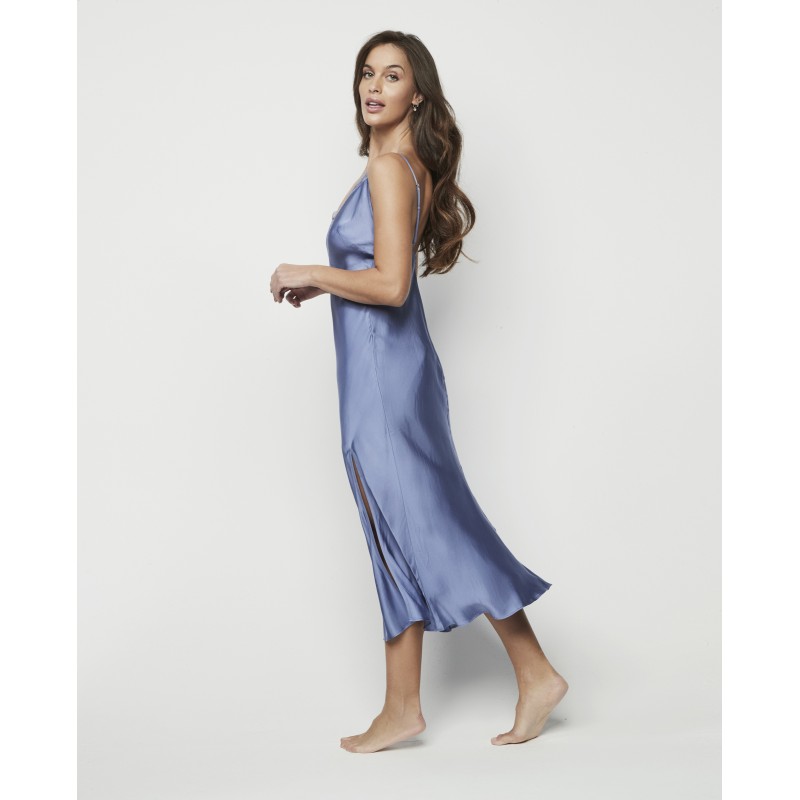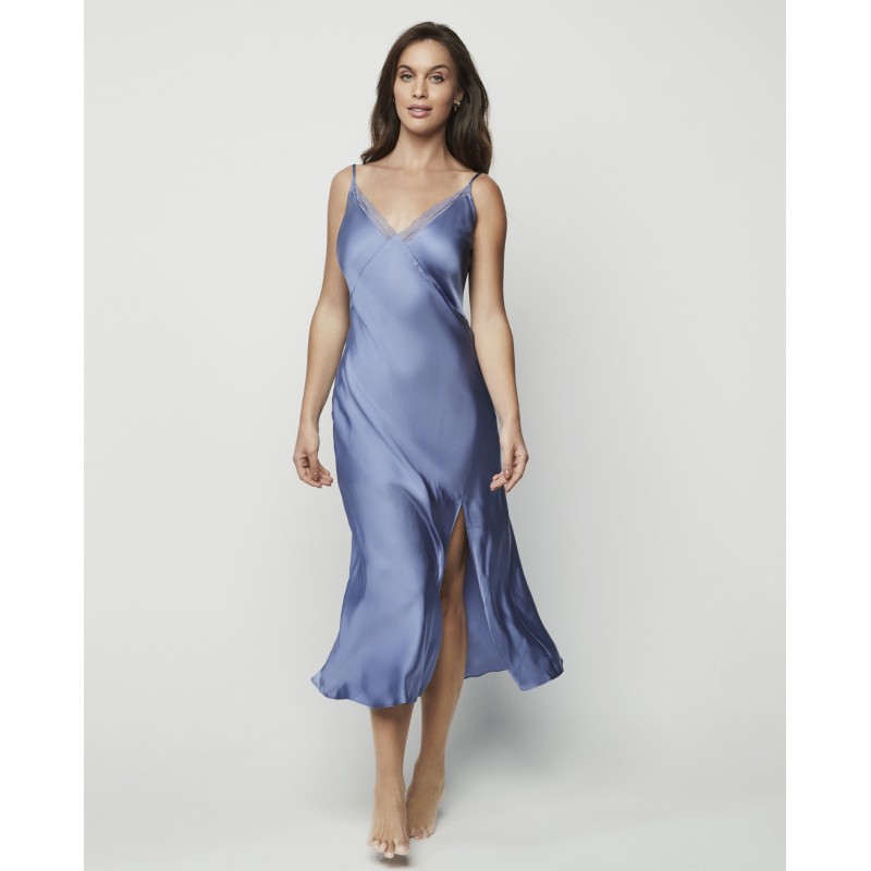 Long nightgown with a plunging V-neckline, open back, and adjustable straps. It has an inner lining and an opening on one side. This is a delicate and sophisticated garment. The Agatha collection, to which it belongs, embodies the maturity and splendor of the brand, offering pieces that not only adorn, but transform. A collection with charm and charisma.