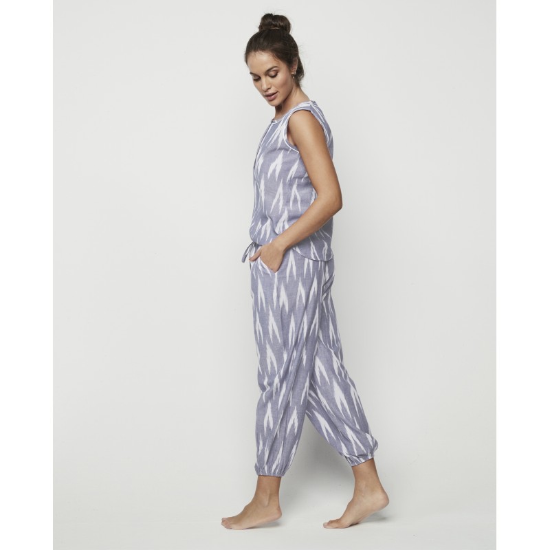 Pyjama set made up of two 100% cotton combined pieces: a round-necked T-shirt with buttons on the chest, together with long, flowing trousers with an adjustable elastic waistband. It has cuffs at the bottom of each leg, which creates a puffed effect. In addition to being a comfortable garment, its ethnic-style print makes it an original garment that evokes freshness and a very youthful style.