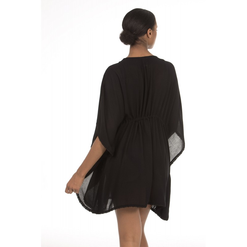 Fluid blouse with French sleeves and transparencies on the neckline. Black.