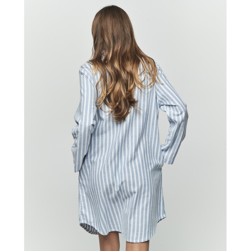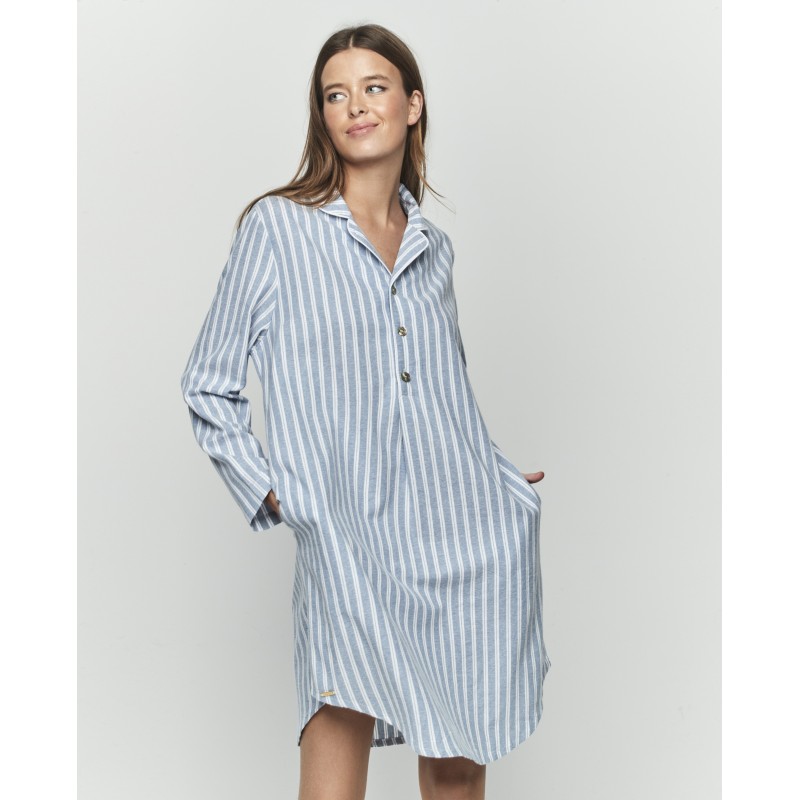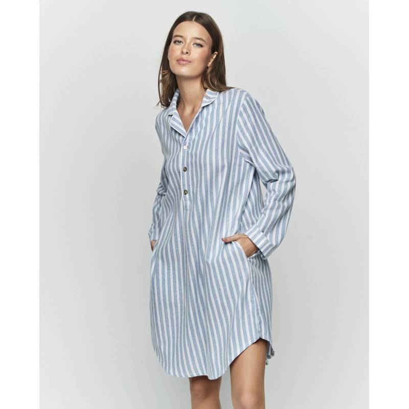 Shirt-style nightgown with sleeves and knee-length. It features a shirt collar and buttons down the front. Its vertical stripes enhance the design and give it a classic touch. This garment is 100% cotton.