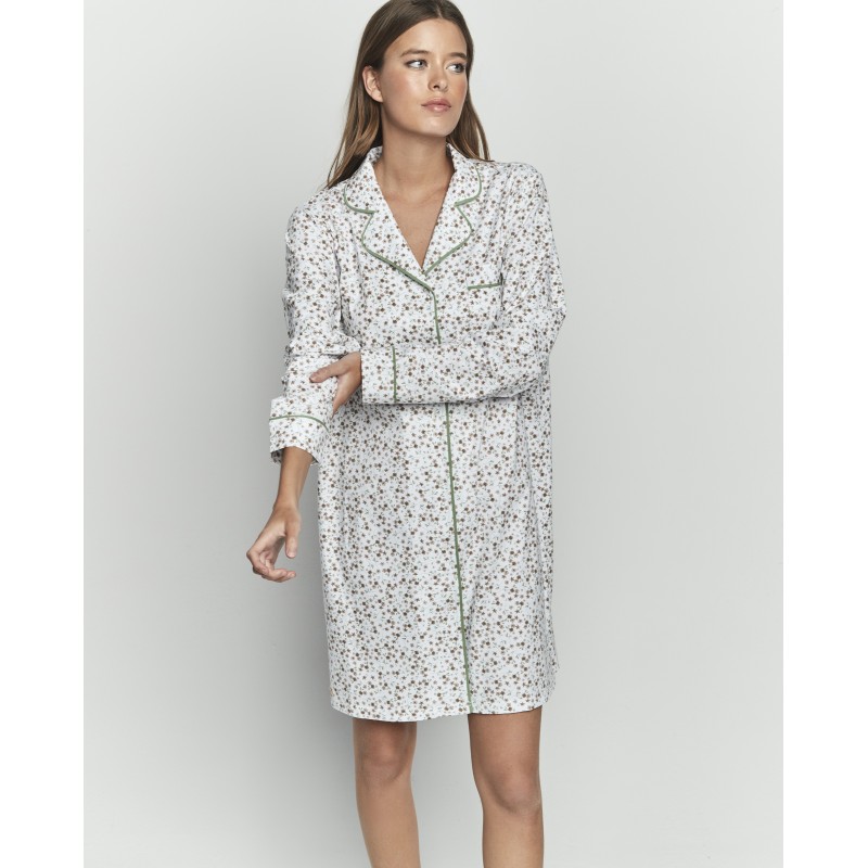 Shirt-style nightgown with sleeves and a knee-length button-down front. Featuring a romantic floral print that offers softness, freshness, and charm in a single garment.