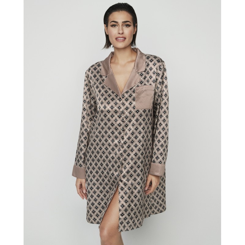 Shirt-style nightgown with sleeves and a knee-length button-front. This exquisite print will add charm and sophistication to every night.