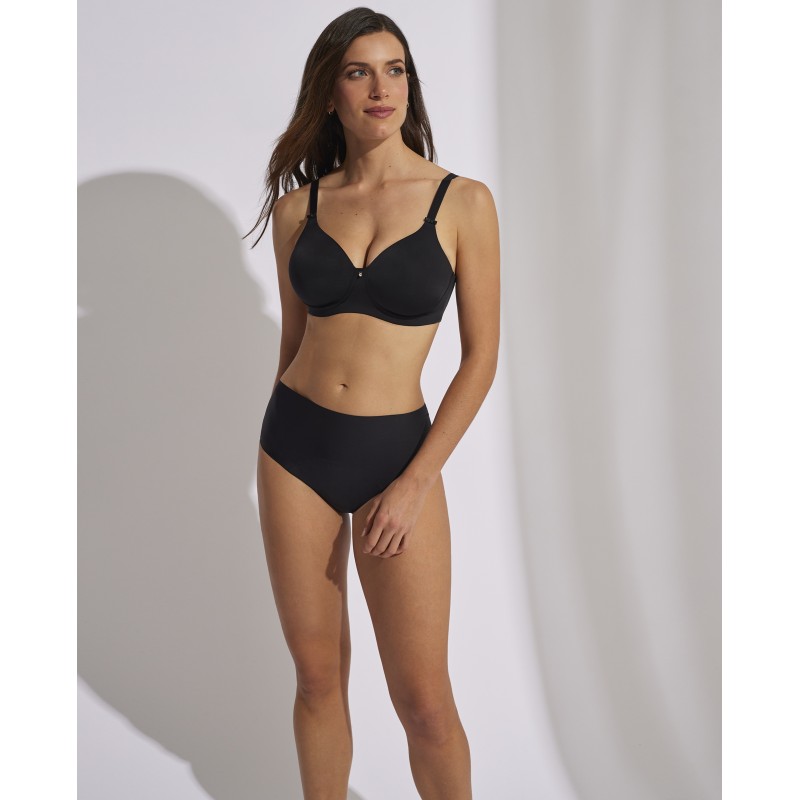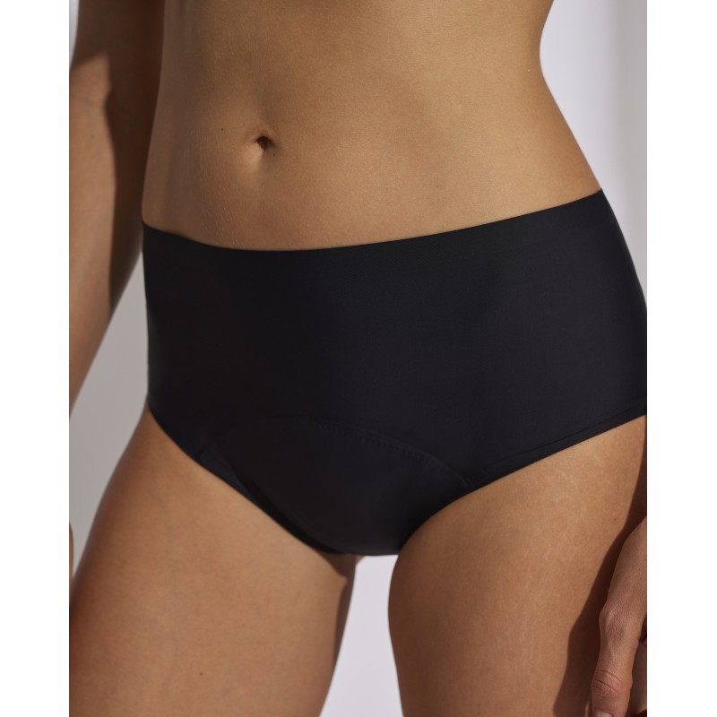 High cut menstrual panty. This garment designed to be worn during the menstrual period is made with absorbent materials that help prevent leaks. It is comfortable, easy to wash and reusable, making it a sustainable and economical option.