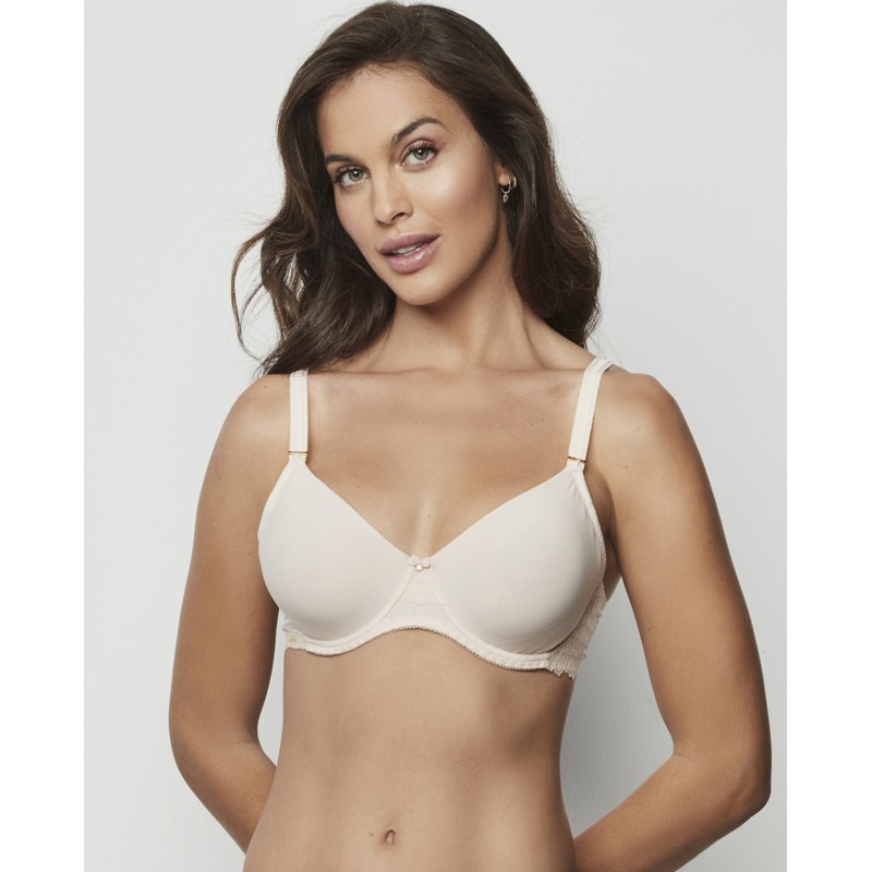 A slimming bra with preformed cups. It has underwires and a base, and no foam cup. It contains and visibly reduces the breast. Both the interior and the back are lined with control tulle. The width of the straps increases according to the size, as does the size of the hook closure. A delicate and sophisticated garment. The Agatha collection, to which it belongs, embodies the maturity and splendour of the brand, offering pieces that not only adorn, but transform. A collection with charm and charisma.