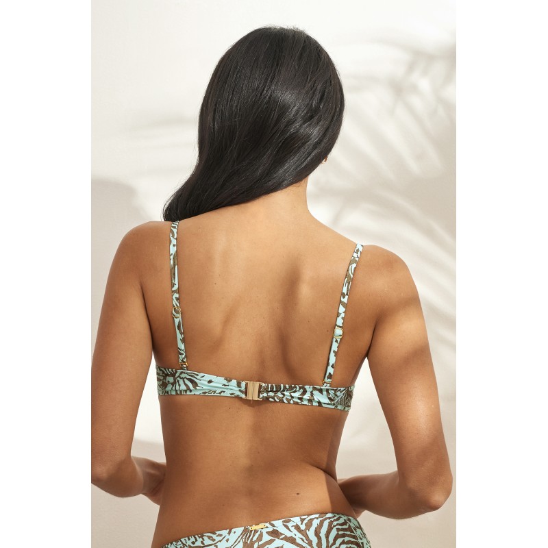 Bikini top with underwire and foam cup. A classic design with straps that provides perfect support and maximum comfort. Made of recycled fabric. Its striking ethnic shell design inspired by dream beaches will captivate you.