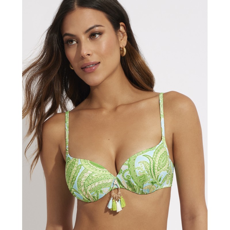 Bikini top with underwire and foam cup. A classic design with straps that provides perfect support and maximum comfort. Its ethnic design gives it a touch of originality and unique style, making this piece different from the others. Its vibrant colors highlight your curves in a subtle but impactful way.