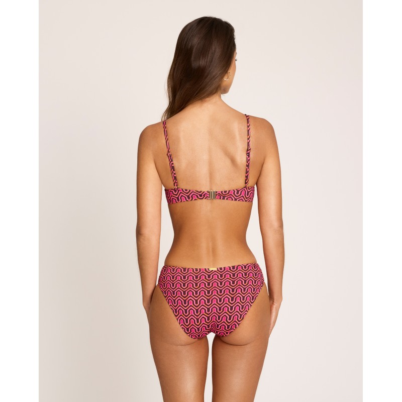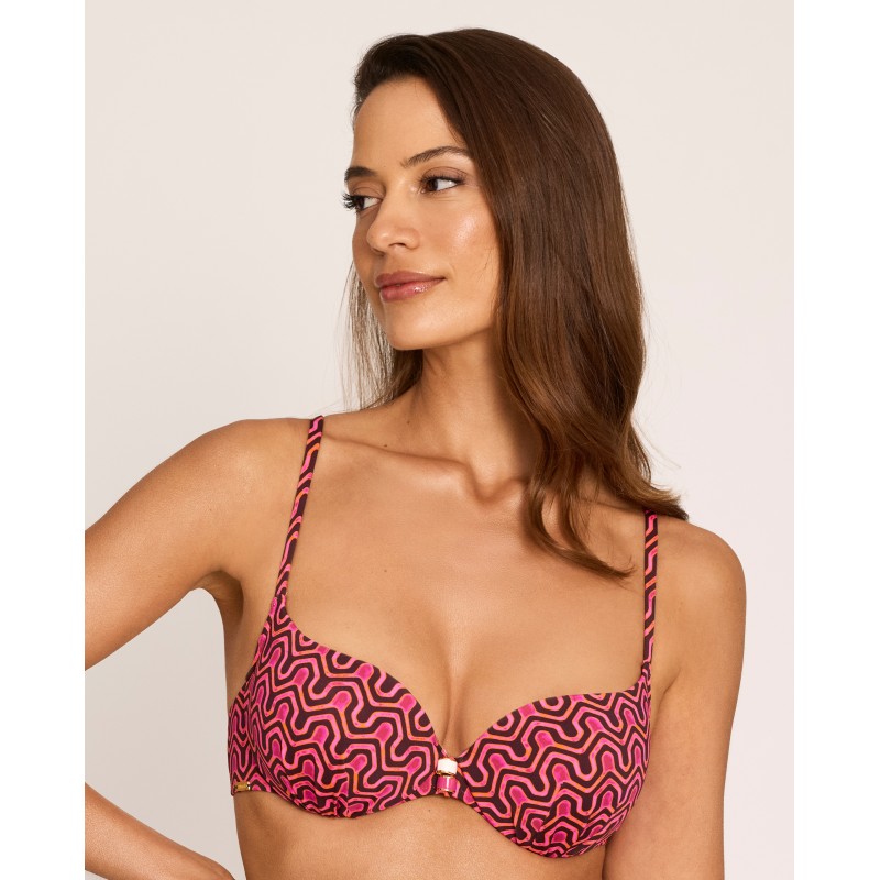 Underwire bikini top with foam cups. Provides perfect support and maximum comfort. Features a geometric print that adds dynamism and a summery feel. A contemporary and sophisticated option for this season. Made with recycled materials.