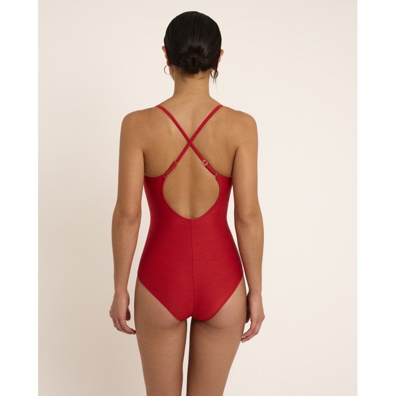 Women's swimsuit with a square neckline. Features built-in cups, no underwire, and crisscross straps. Part of a swimwear collection with clean lines and timeless design, where simplicity becomes elegance. Designed for women who appreciate understated sophistication.