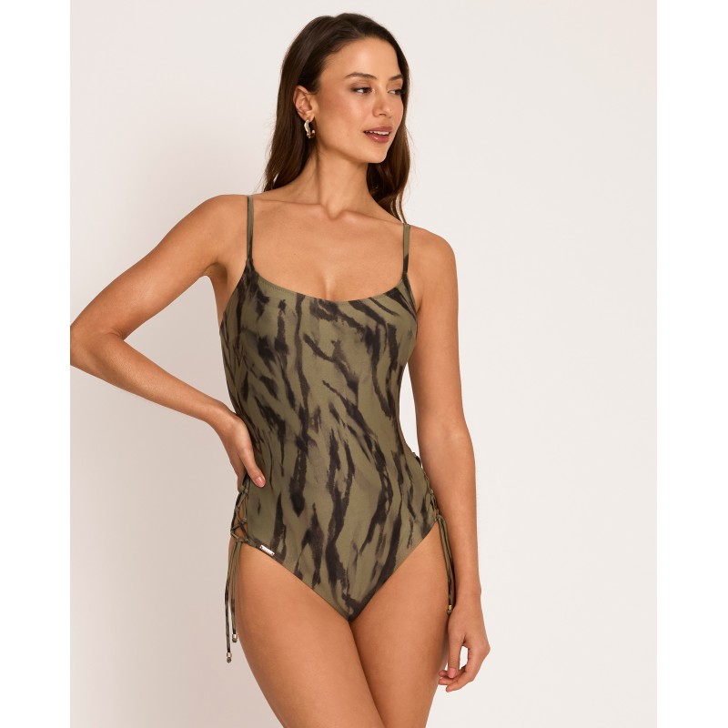 Shaping swimsuit with foam cups and no underwire. Features a V-neck and multi-position straps. Its wild-inspired design connects us with our natural instincts and the inner strength of a confident and sensual femininity. This piece is made with recycled raw materials.