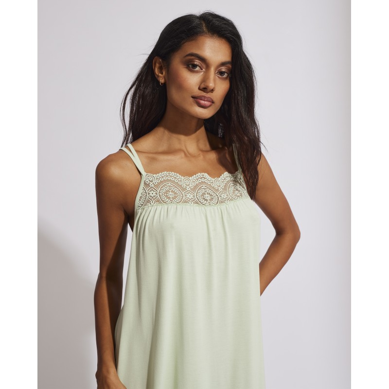 Nightgown with double straps. Its classic design with lace details gives it a romantic and bohemian style at the same time. This garment combines sensuality, freshness and elegance, ideal for free and authentic women.