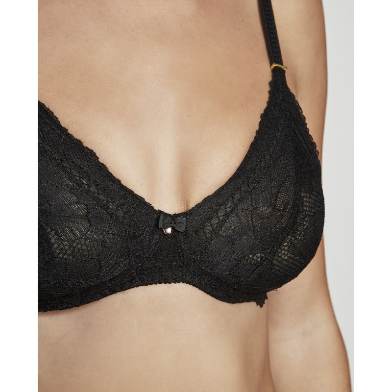 Floral lace triangle bra without underwire and without foam cup. A model designed to provide extra comfort. Its interior, as well as its back, is preformed with control tulle and has a base to provide structure. It has two strap widths depending on the size, as does its hook closure, with the aim of adapting to provide comfort and the best support. A delicate and sophisticated garment. The Agatha collection, to which it belongs, embodies the maturity and splendor of the brand, offering pieces that not only adorn, but transform. A collection with charm and charisma.