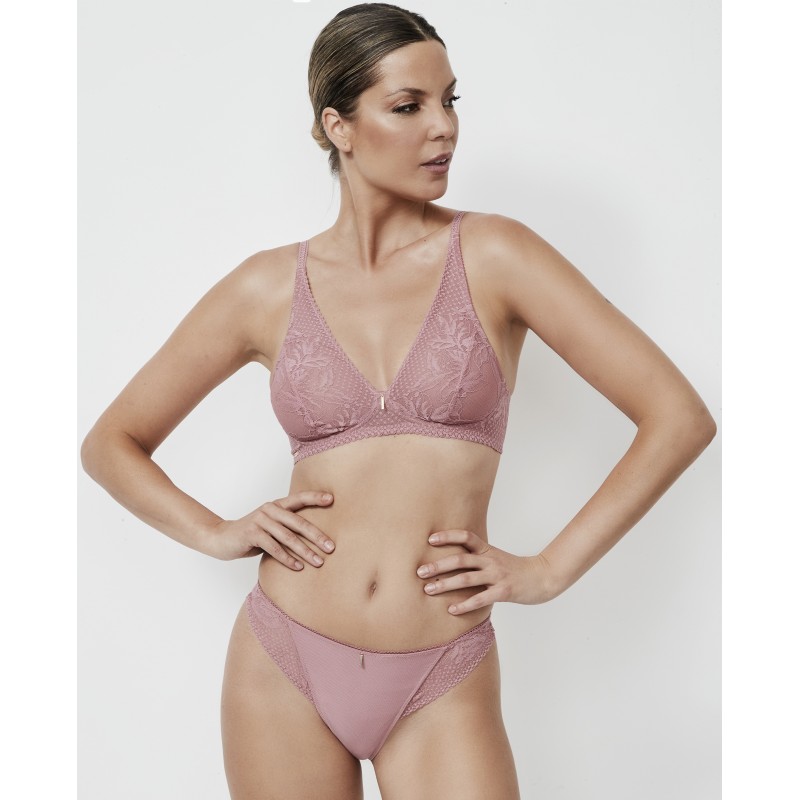 Floral lace triangle bra, non-wired and without foam cups, bralette-style. A style designed to provide extra comfort. Its interior, as well as the back, are preformed with control tulle and have a base for structure. The straps come in two widths, depending on the size, as does the hook-and-eye closure, designed to adapt to provide comfort and optimal support. The Malitzia collection, to which it belongs, represents a perfect dance between delicate and daring.