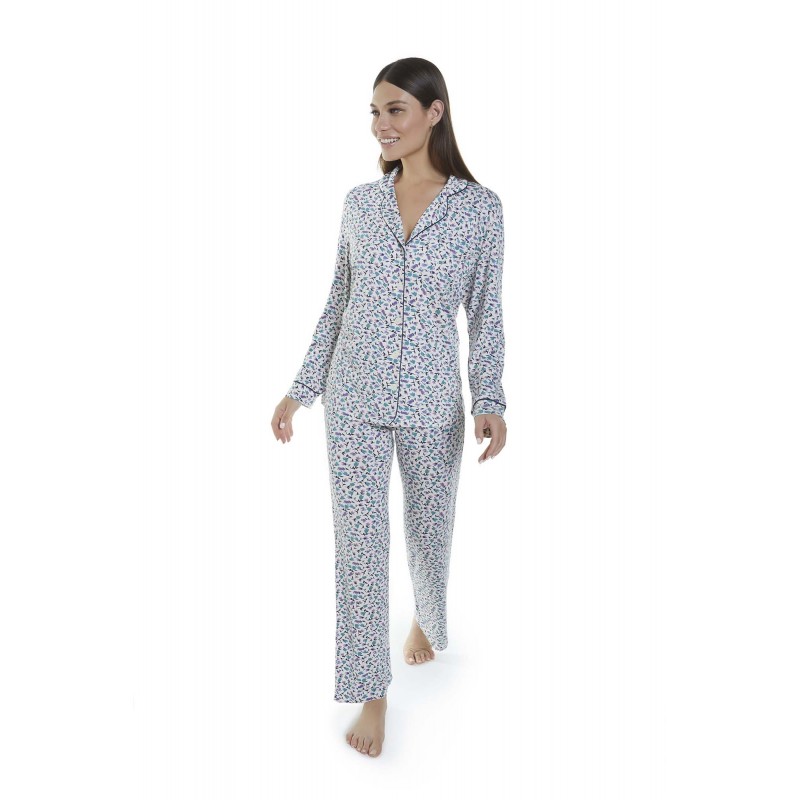 Shirt pajamas consisting of long pants and a shirt-cut top. A floral print design that adds a touch of freshness to the winter season.