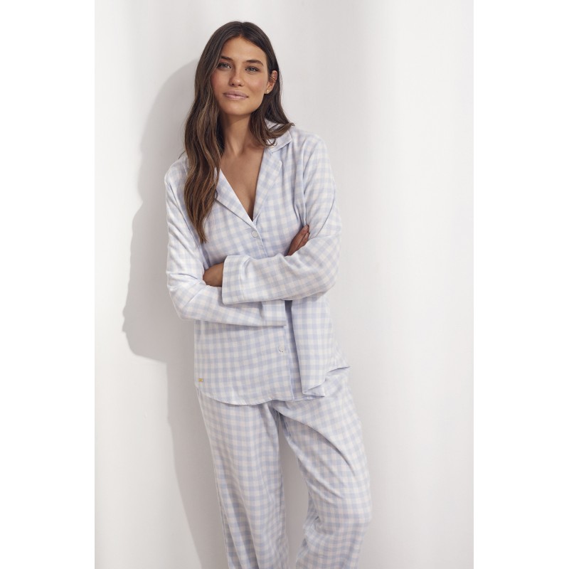 Full shirt style pajamas. A very youthful checkered design made up of a top with a shirt cut with front button closure and long pants.