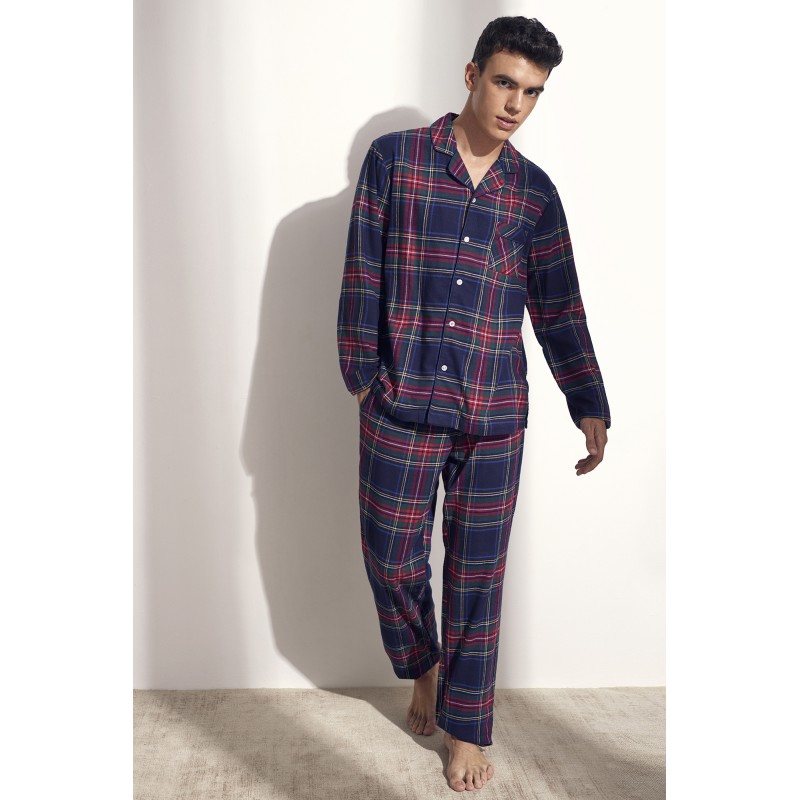 Men's full shirt style pajamas. With a checkered design made up of a top with a shirt cut with front button closure and long pants.