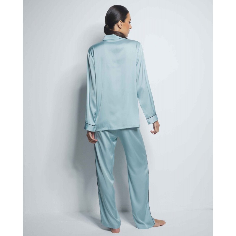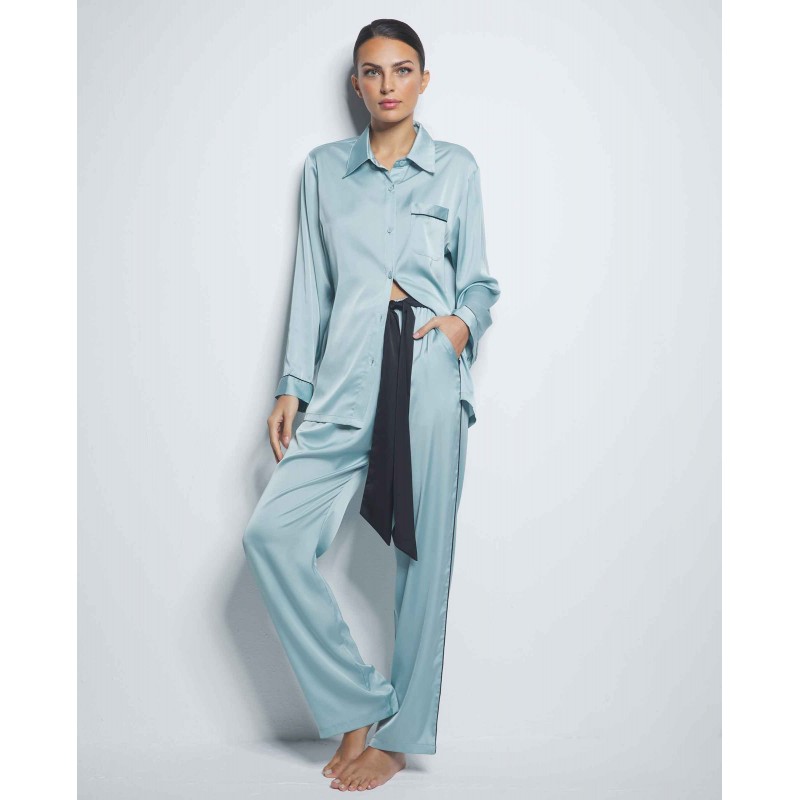 Complete shirt style pajamas. Composed of front closure top and long pants. Designed to enhance the femininity and sensuality of women, offering an attractive and seductive look without sacrificing comfort.