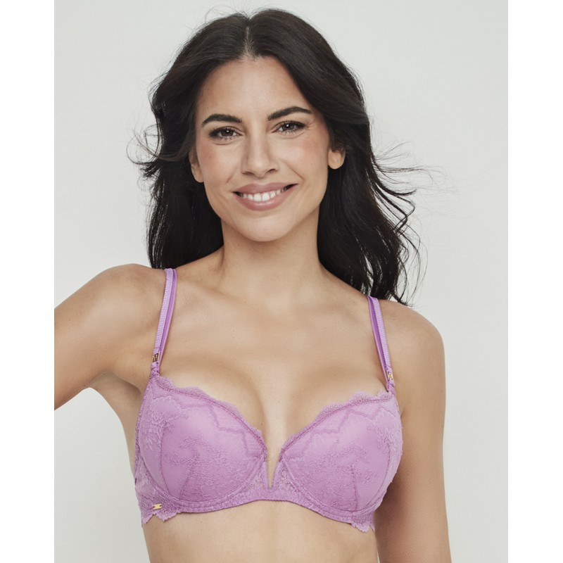Push-up bra with a plunging neckline. It lifts and enhances the bust, increasing it by up to one cup size. It features underwire and foam push-up cups. The straps have flat, discreet buckles and multi-position hooks that allow them to be joined at the upper back for a halter or racerback look without being visible. This piece blends elegance and comfort, designed for real, free, and confident women. It belongs to the Manuela collection, created to enhance inner beauty and celebrate the authenticity of every woman. For those who want to feel not only beautiful, but also comfortable and confident in their own skin.