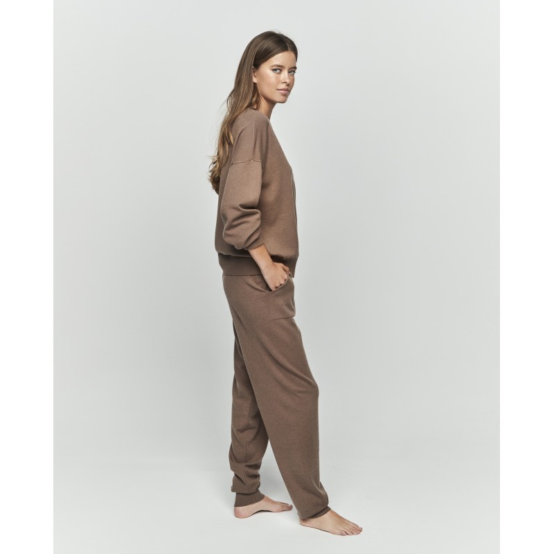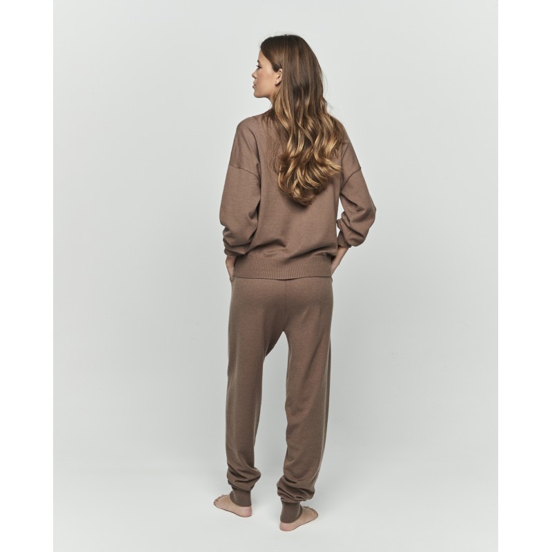 Completo in maglia composto da maglia a maniche lunghe con scollo rotondo e pantaloni lunghi con polsini e tasche. Un capo versatile che ti accompagnerà dalla comodità di casa alle tue attività all'aperto.