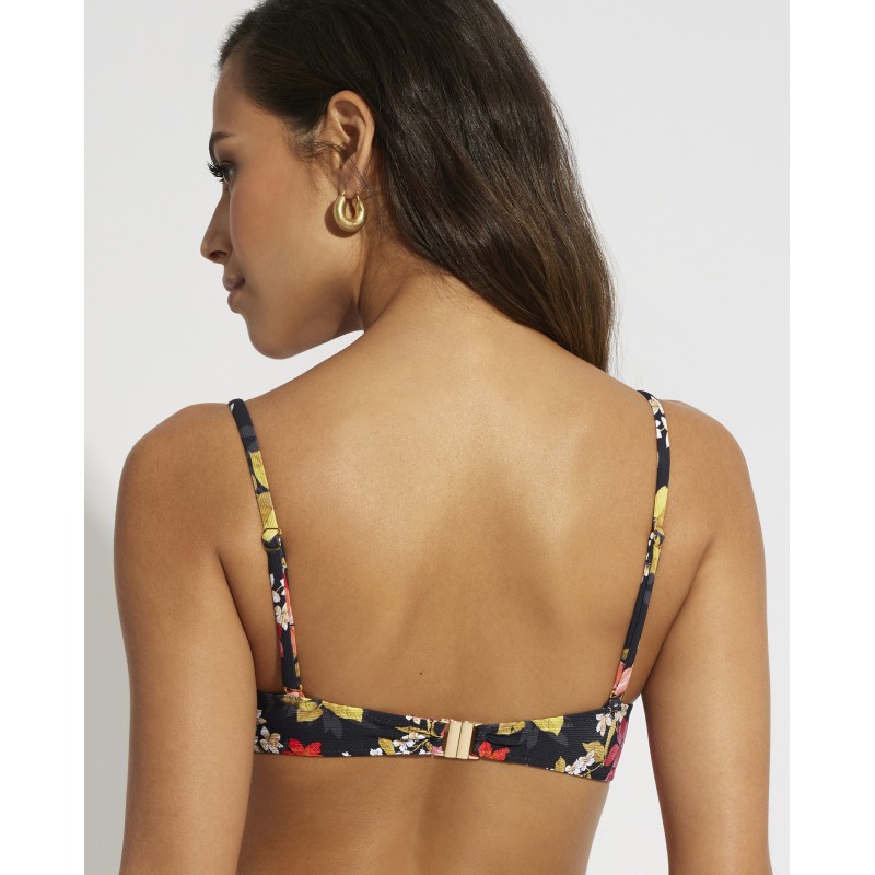 Semi-balconette bikini top with underwire. With multi-position straps. This floral and colorful design is perfect for looking radiant and vibrant at the beach or pool this summer.