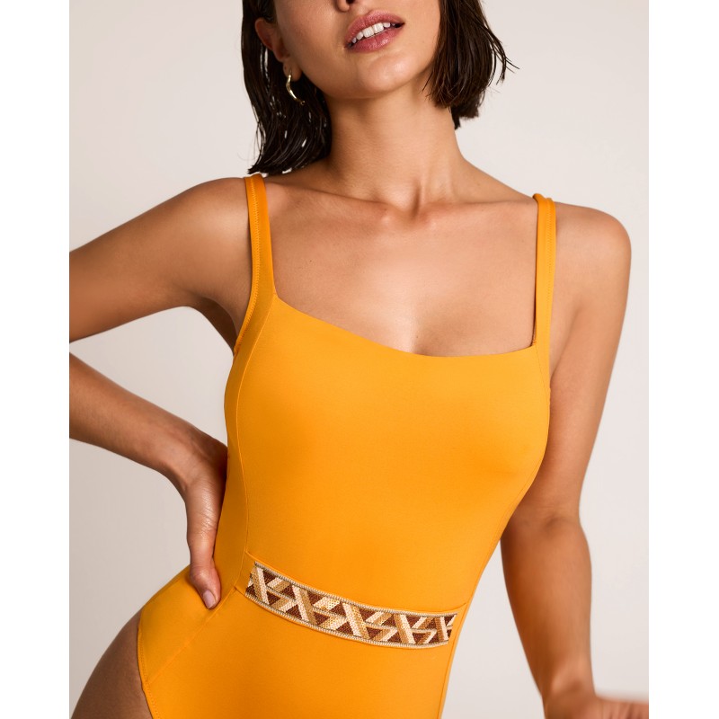 Shaping swimsuit with underwire and no foam. Shaping effect. An elegant piece defined by the purity of its solid color, elevated by geometric details that add character and uniqueness.