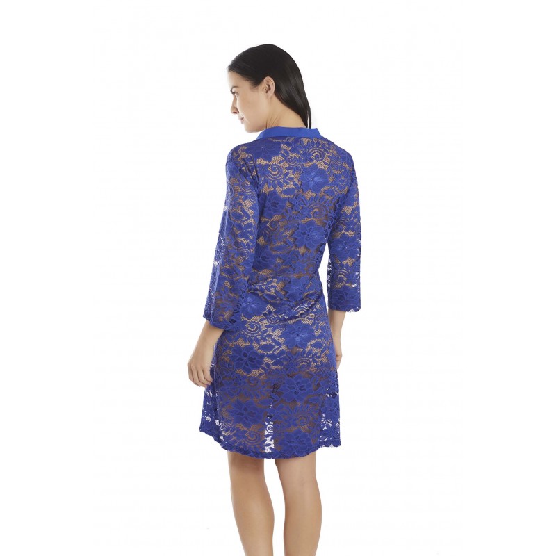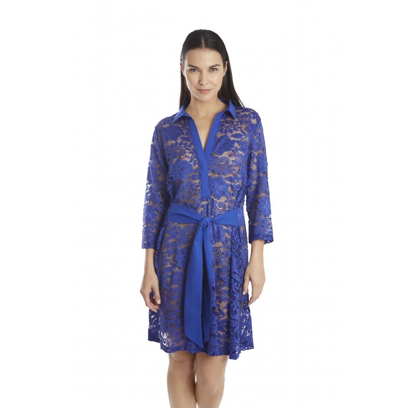 Shirt dress with shirt collar and lace with floral motifs. Lasso at the waist as a belt. A design designed not to give up elegance in your summer look.
