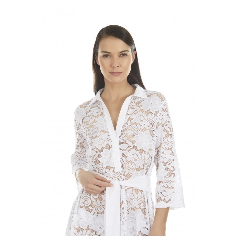 Shirt dress with shirt collar and lace with floral motifs. Lasso at the waist as a belt. A design designed not to give up elegance in your summer look.